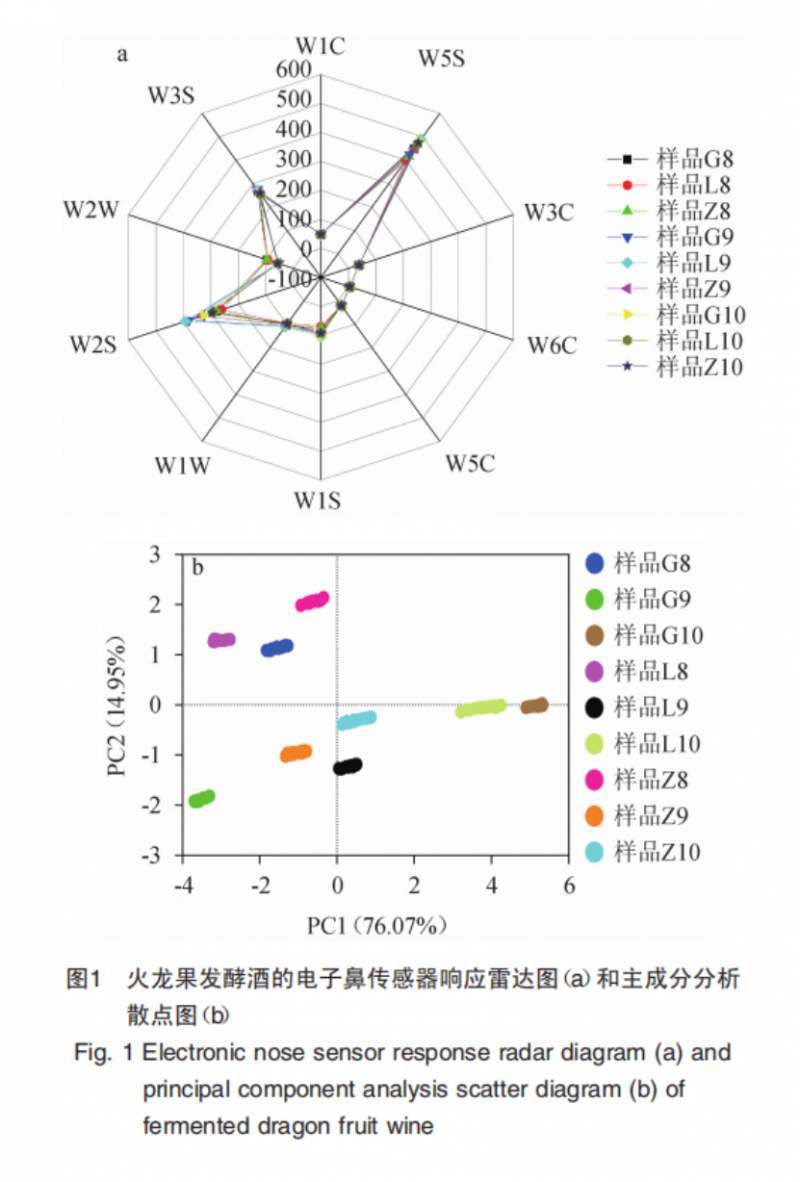 本研究利用智能感官技術(shù)(電子鼻和電子舌)及頂空固相微萃取-氣質(zhì)聯(lián)用技術(shù)(HS-SPME-GC-MS)對貴州產(chǎn)地(關(guān)嶺、羅甸和貞豐)和采收時間(8月、9月和10月)的火龍果所釀造發(fā)酵酒的揮發(fā)性風(fēng)味成分進(jìn)行了系統(tǒng)的研究。