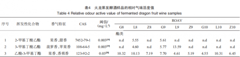 為了進(jìn)一步明確上述主要揮發(fā)性風(fēng)味成分中對風(fēng)味的呈現(xiàn)有突出貢獻(xiàn)的物質(zhì),對這些樣品中的揮發(fā)性風(fēng)味成分進(jìn)行ROAV分析,火龍果發(fā)酵酒樣品的ROAV見表4。