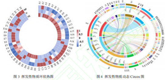 聚類熱圖與動態(tài)Circos圖都可以結合大量數(shù)據,以漸進色帶和對應顏色標簽的占比形式共同將檢測得到的各揮發(fā)性化合物與三組樣品的相關性直觀的展現(xiàn)出來。結合圖3、圖4分析可知,在HS樣品中醇類(A)物質相對含量及種類較多,其中包括芳樟醇(A4)、2-壬醇(A5)和2-十二烷醇(A12)等物質。FJ樣品中酮類(E)物質相對含量與種類相較另外兩組樣品較多,主要包括:2-壬酮(E3)、2-十一酮(E4)等物質。WF樣品中醛類(B)與酸類(C)物質占據主導,其中芳樟醇(A4)、苯乙醛(B3)等物質為濃汁本身提供了堅果香氣與櫻桃香氣,并且酸類在其發(fā)酵過程中為其他風味物質的形成提供了前體物質。這一結果與表1及PCA分析一致。