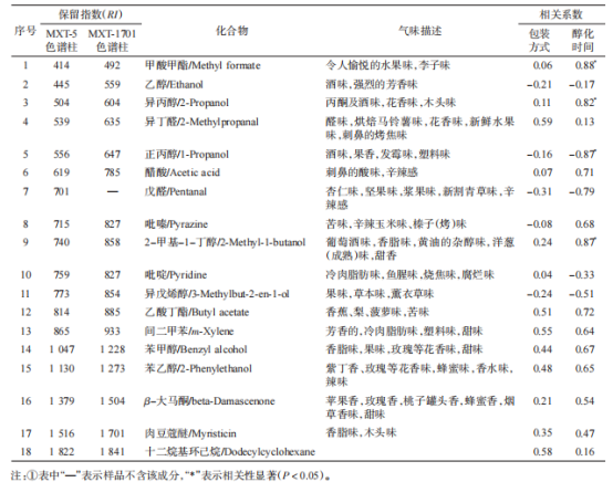 在PCA分析的基礎(chǔ)上,將各組分的保留時(shí)間轉(zhuǎn)化為保留指數(shù),再通過(guò)AroChembase數(shù)據(jù)庫(kù)(包括15萬(wàn)種化合物的保留指數(shù)值)進(jìn)行定性,篩選出了18種可能的差異揮發(fā)性成分,并進(jìn)行感官描述。醇化片煙揮發(fā)性差異成分、感官描述信息及相關(guān)系數(shù)見表1。可以看出,不同包裝方式和醇化時(shí)間片煙中的主要揮發(fā)性差異化合物包括醇類(7種)、醛類(2種)、酯類(2種)、雜環(huán)化合物(2種)和其他化合物(5種)。結(jié)合圖3的峰面積可知,各處理醇化片煙中含量較高的化合物均為醋酸、異丙醇、甲酸甲酯、β-大馬酮和戊醛。