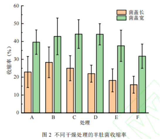 不同熱風(fēng)干燥方法對羊肚菌菌蓋收縮率的影響如圖2所示。F處理菌蓋長度、菌蓋寬度收縮率最小,其次為E處理和A處理。B處理的菌蓋長收縮率最大,C處理菌蓋寬收縮率最大。