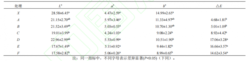 羊肚菌復(fù)水后的色差值△E順序?yàn)?/span>A處理>B處理>C處理>F處理>E處理>D處理,A、B、C處理的色差值△E與新鮮羊肚菌X無顯著性差異(P>0.05),說明這幾種干燥處理方法對羊肚菌的顏色影響相對較小,能夠保證羊肚菌復(fù)水以后的外觀色澤,有利于商品性的提升。