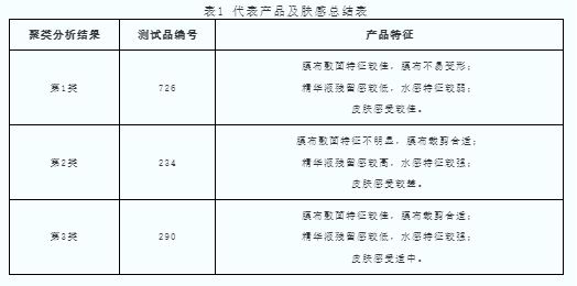 (1)通過感官Q(mào)DA測試,結(jié)合主成分分析與聚類分析,定位該類面膜的主要感官屬性,總結(jié)3類面膜的膚感特征,選出每一類的代表品;