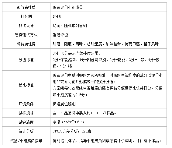 伊比西經(jīng)過(guò)多輪調(diào)試后,最終確定方案采用普魯斯特200濃縮香精及席蔓200LN 01濃縮香精兩支產(chǎn)品,并對(duì)最終方案進(jìn)行了內(nèi)部感官評(píng)價(jià)小組感官測(cè)試,并給出相應(yīng)的感官評(píng)價(jià)結(jié)果。具體感官評(píng)價(jià)方法如下表: