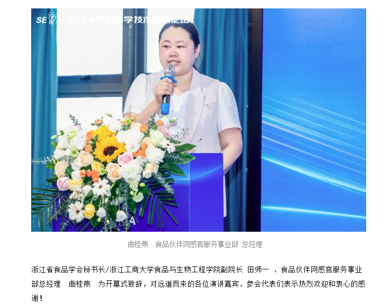 2024年5月15日,由食品伙伴網(wǎng)和浙江省食品學(xué)會(huì)聯(lián)合主辦,全球化學(xué)感官研究聯(lián)盟(GCCR)、湖北省照明學(xué)會(huì)、西安交通大學(xué)第二附屬醫(yī)院、上海盛評(píng)檢測(cè)技術(shù)有限公司協(xié)辦,濟(jì)南智感分析儀器有限公司、煙臺(tái)食邦信息科技有限公司、感知網(wǎng)共同支持的“2024 感官科學(xué)技術(shù)創(chuàng)新論壇”在杭州萬信瑞鉑酒店盛大開幕!
