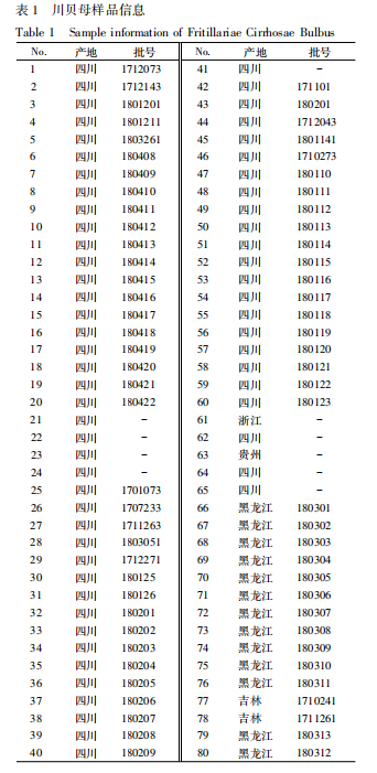 外觀性狀不滿足的樣本有23,24,43~46,61~80 號; 顯微結(jié)果顯示樣本 71,74,78 號不含螺紋導管,其余均滿足藥典要求; 薄層結(jié)果顯示樣本 23,24 號中不含貝母素乙,61~80 號與平貝母對照藥材相對應的位置顯相同顏色的斑點; 80 個樣本貝母素甲、西貝母堿、貝母素乙 3 種生物堿總量均為 0~0. 05%,判別結(jié)果見表 2。