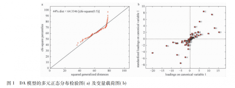 DA 辨識模型及交互驗證 80 個樣本的測試結(jié)果多元正態(tài)分布檢驗圖見圖 1,橫坐標為平方廣義距離,縱坐標為卡方上側(cè)分位數(shù)對應的檢驗值。樣本分布圖形略呈線性; 約 44%的距離小于卡方分布分位數(shù)表 0. 5 對應的檢驗值,說明檢驗值在卡方分布分位數(shù)表 0. 5 對應的檢驗值的下側(cè)分布略微集中。