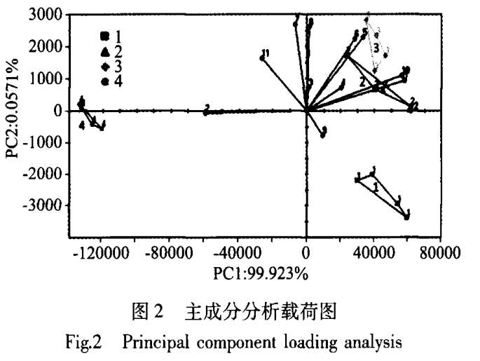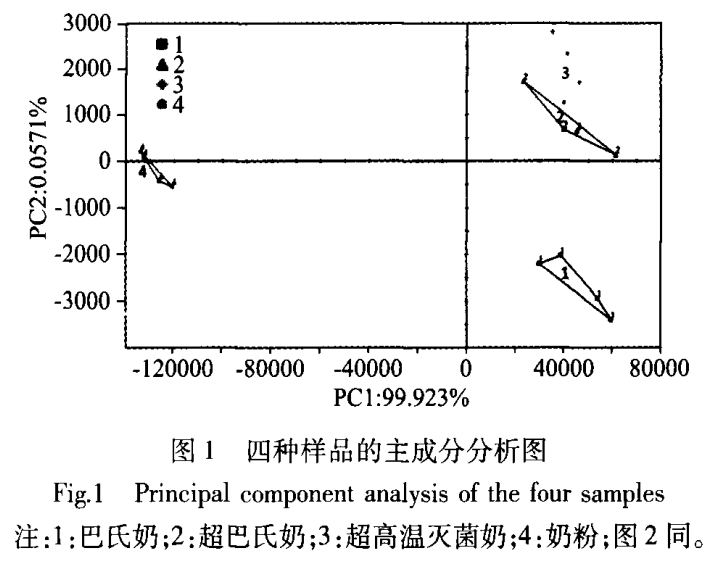 數(shù)據(jù)處理 對電子鼻采集的樣品數(shù)據(jù)運用儀器Alphasoft軟件中多變量統(tǒng)計分析,來實現(xiàn)主成分分析、樣品間區(qū)別指數(shù)分析和主成分載荷圖分析;結(jié)合保留指數(shù)和AroChembase數(shù)據(jù)庫對未知化合物進行定性分析。 結(jié)果與分析 主成分分析(PCA) 對四種不同處理方式的牛奶作PCA分析,結(jié)果如圖1所示。第一主成分的方差貢獻率為99.923%,第二主成分的方差貢獻率為0.0571%,兩者累積的總貢獻率為99.97%,表明此圖譜能夠較好地反應出所測樣品中氣味數(shù)據(jù)的完整性。同時,判別指數(shù)(discrimination index,DI)是數(shù)據(jù)統(tǒng)計軟件分析PCA時用于表征樣品之間區(qū)分度的體現(xiàn)。DI值在80~100之間表示該數(shù)據(jù)區(qū)分分析結(jié)果為有效結(jié)果,DI值越大效果越佳。圖中PCA的判別指數(shù)為87,表明此樣品間的區(qū)分效果為有效區(qū)分。在主成分分析中,樣品之間的相對距離越近,表明樣品的整體氣味越近,則差異越小,反之差異則越大。 從圖1中可以看出四種加工方式的樣本之間均存在著較為明顯的差異,其中奶粉與其他三種加工方式樣品的相對氣味距離均較遠,差異較大。超巴氏奶與超高溫滅菌奶的氣味距離相對較近,表明差異較小。