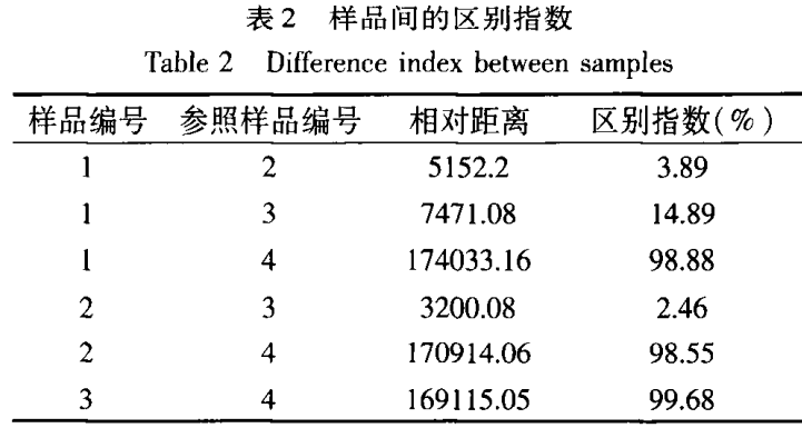 樣品間區(qū)別指數(shù)分析 區(qū)別指數(shù)是基于主成分分析圖中的兩個樣品組簇團之間的相對距離計算而出的,兩個樣品組間簇團距離越大同時樣品組內(nèi)的差異越小,則兩個樣品組的區(qū)別指數(shù)就越接近100%,即區(qū)別指數(shù)越大則表示樣品組間的區(qū)別越大,反之越小。如表2所示,4號奶粉樣品與1號巴氏奶、2號超巴氏奶及3號超高溫滅菌奶的區(qū)別指數(shù)均較大,且與3號超高溫滅菌奶的差異最大。同時,2號超巴氏奶與3號超高溫滅菌奶的區(qū)別指數(shù)最小,則表明差異最小。