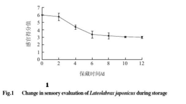 如上圖,保藏初期鱸魚新鮮無異味、鰓絲鮮紅清晰、體色鮮艷有光澤,肌肉僵硬良好;第4天鱸魚眼角膜稍有混濁,鰓色部分變暗紅,魚體開始變軟,與前2d相比質(zhì)量下降明顯,感官的分值為4.4;第6天眼球平坦,眼角膜較渾濁,鰓大部分變暗紅色,略有腥臭味,魚體色澤較暗,肌肉彈性較差,第8天鰓全部變?yōu)榘导t色且有黏液,魚體無光澤,鱗片無脫落。感官的分值為3.2;第10天魚體腥臭味變大,肌肉變軟,手指按壓后彈性不易消失;第12天眼球平坦,鰓色變褐,腥臭味大,感官得分值為3.0。