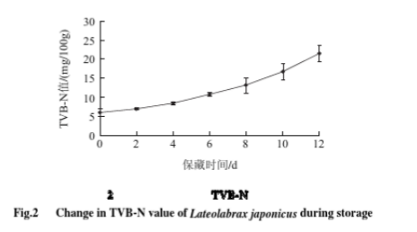 由上圖可知,保藏前4d TVB-N值上升比較緩慢,第4天開始上升加速,說明鱸魚品質(zhì)從第4天開始下滑較快;而由圖一感官得分的變化可知,從第2天開始鱸魚感官品質(zhì)明顯下降,說明在保藏初期鱸魚感官變化比TVB-N的變化更靈敏。第12天鱸魚的TVB-N值為21.6mg/100g,整個保藏過程中TVB-N值均為超過GB/T 18108-2008三級標準的要求(小于30mg/100g)。
