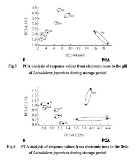 通過對鱸魚進行感官評定、TVB-N和菌落總數(shù)分析,發(fā)現(xiàn)運用PCA分析電子鼻檢測結(jié)果與TVB-N值和菌落總數(shù)變化相應(yīng),證實了電子鼻檢測鱸魚新鮮度的可行性。
