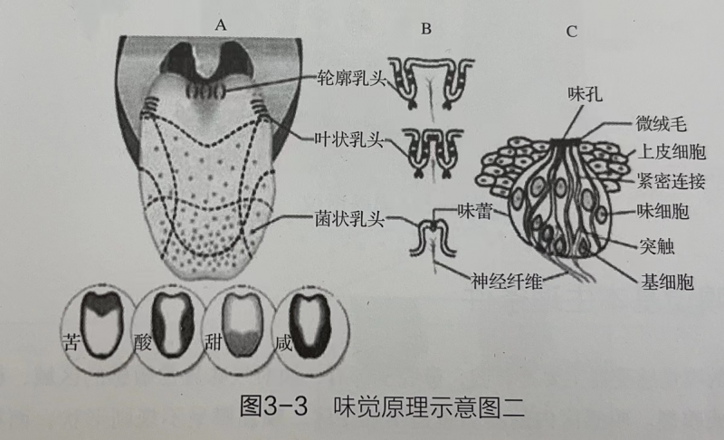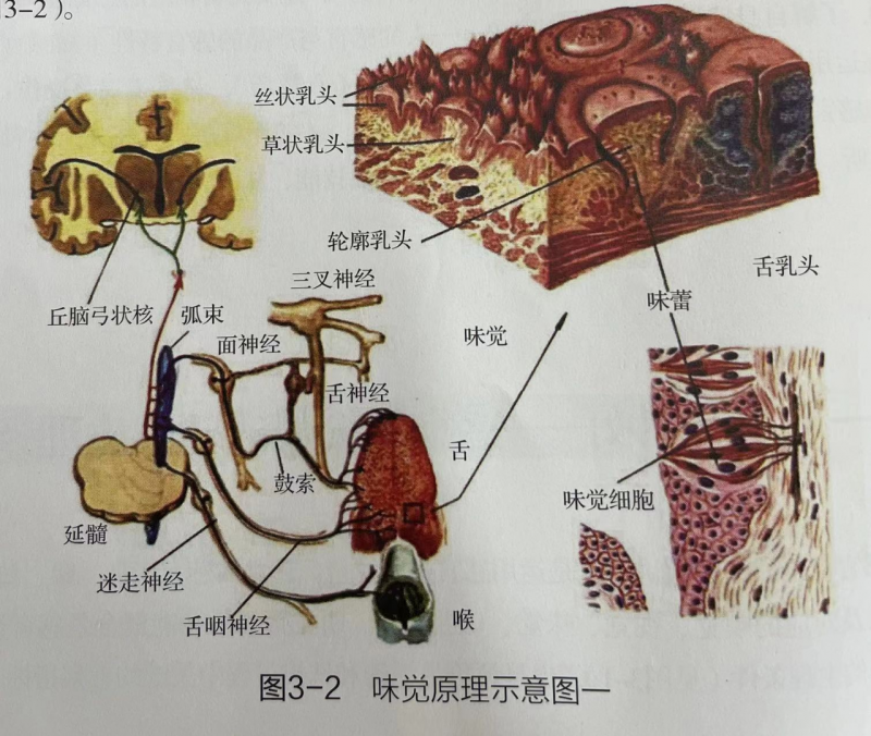 可溶性呈味物質(zhì)進入口腔后,在舌肌作用下與味蕾接觸,刺激味蕾中的味細胞產(chǎn)生神經(jīng)沖動,以脈沖的形式通過神經(jīng)系統(tǒng)傳至大腦皮層味覺中樞后產(chǎn)生味覺(圖3-2)。