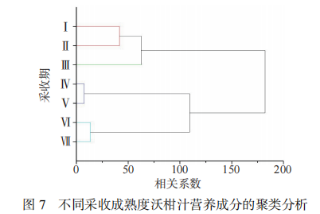 采用系統(tǒng)聚類分析方法對不同采收成熟度沃柑汁的營養(yǎng)成分進行R型聚類,聚類方法為組間聯(lián)接法,聚類區(qū)間為平方歐式距離,由圖7結果可知,采收期Ⅰ、Ⅱ沃柑汁歸為一類,采收期Ⅲ的沃柑汁歸為一類,采收期Ⅳ、Ⅴ沃柑汁歸為一類,采收期Ⅵ、Ⅶ沃柑汁歸為一類。綜合維生素C、總酚、氨基酸、類胡蘿卜素、檸檬苦素含量變化考慮,Ⅳ、Ⅴ采收期的沃柑營養(yǎng)成分含量均較高。