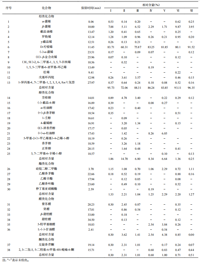 電子鼻驗證了不同成熟度沃柑可以準確區(qū)分,GC-MS進一步研究了不同成熟度沃柑揮發(fā)性香氣成分的區(qū)別及變化,結果見表5,可以看出不同采收成熟度的沃柑汁主要香氣物質(zhì)共分離出38種,其中烴類13種、醇類12種、酯類5種、醛類6種、酮類2種。不同采收成熟度沃柑汁的香氣成分相對含量最高為烴類。