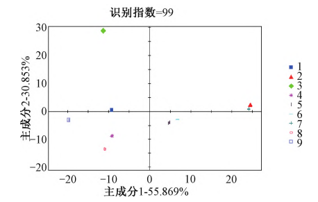 由圖4可知,PC1與PC2的貢獻(xiàn)率之和達(dá)到了95.057%,其識(shí)別指數(shù)達(dá)到99,說(shuō)明基于氣味上的差異能有效區(qū)分不同產(chǎn)地地黃樣品。河南溫縣與甘肅所產(chǎn)“北京3號(hào)”各單獨(dú)分布在一個(gè)區(qū)域,與其他產(chǎn)區(qū)氣味差別較大;山西與陜西所產(chǎn)“北京3號(hào)”氣味差別較小,利用AroChemBases數(shù)據(jù)庫(kù)對(duì)篩選出的差異較大的色譜峰進(jìn)行定性可知,生地黃氣味差異可能由于乙醛、乙醇、2,3?丁烷、乙腈、己醛等揮發(fā)性氣體含量差異引起,說(shuō)明使用電子鼻能迅速區(qū)分同一品種不同產(chǎn)地生地黃。