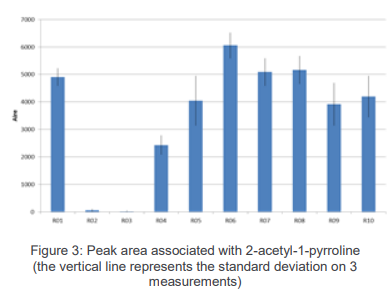 2-乙酰基-1-吡咯啉是巴斯馬蒂香米的主要特征香味化合物,從原始數(shù)據(jù)中可以看出,對比不同樣品,其含量的大小可比較。