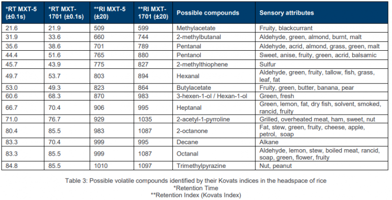 本研究表明,Heracles主成分分析可以在采集完樣品之后直接區(qū)分大米的氣味差異,同時此次實驗還成功地用于快速比較幾種大米樣品中2-乙?;?1-吡咯啉的含量,以及氧化指標(biāo)(己醛)的含量。