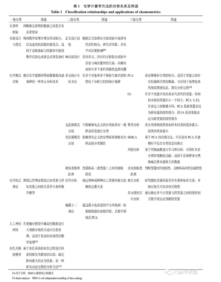 化學(xué)計(jì)量學(xué)是一門(mén)新興的化學(xué)分支學(xué)科,被廣泛應(yīng)用于分析化學(xué)的各個(gè)領(lǐng)域,對(duì)現(xiàn)有研究中中藥材感官信息定量時(shí)常用的化學(xué)計(jì)量學(xué)方法進(jìn)行總結(jié),并參照《化學(xué)計(jì)量學(xué)方法》及《化學(xué)計(jì)量學(xué)方法及MATLAB實(shí)現(xiàn)》,整理出以上各計(jì)量學(xué)方法的分類(lèi)關(guān)系及用途見(jiàn)表1。
