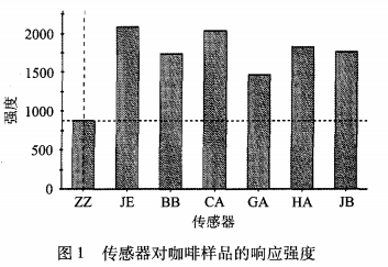 該 實(shí) 驗(yàn) 所 用 的 傳 感 器 為 非 特 異 性 、交 互 敏 感 型 傳 感器 。7個(gè) 傳 感 器 分 別 是 zz、JE、BB、CA、GA、HA 和 JB。各 傳 感 器 對(duì) 風(fēng) 味 物 質(zhì) 普 遍 響 應(yīng) ,沒(méi) 有 絕 對(duì) 的 對(duì) 應(yīng) 關(guān) 系 。圖 1表 示 傳 感 器 對(duì) 咖 啡 樣 品 的 響 應(yīng) 強(qiáng) 度 圖 ,其 中 JE 和 CA 對(duì) 咖 啡 樣 品 的 響 應(yīng) 強(qiáng) 度 最 大 ,傳 感 器 響 應(yīng) 強(qiáng) 度 JE>CA>HA>JB。