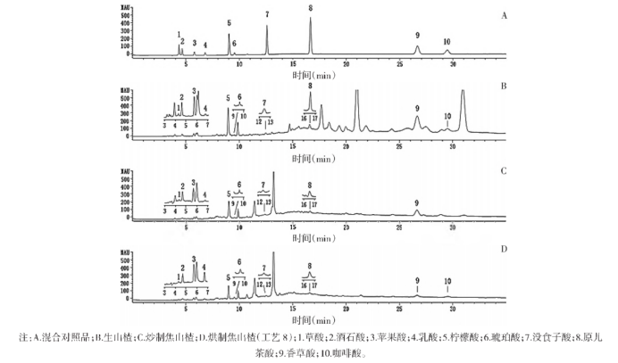 HPLC法測定水溶性有機酸成分 色譜條件 HypersilODS2色譜柱(4.6mm×250mm,5μm),流動相:0.1%磷酸水溶液(A):甲醇(B)梯度洗脫(0~10min,1%~25%B;10~28min,25%B;28~30min,25%~1%B;30~35min,1%B),檢測波長:210nm,流速:0.8mL/min,柱溫為27.5℃,進樣量10μL。 樣品測定 取山楂飲片,粉碎后過80目篩,稱取過篩后細粉1.0g,加25mL純水,30℃超聲30min,4000r離心10min,離心半徑15cm,取上清液過0.45μm微孔濾膜,每組樣品制備3份,生山楂、炒制焦山楂和烘制焦山楂(工藝8)的液相色譜圖見圖2。