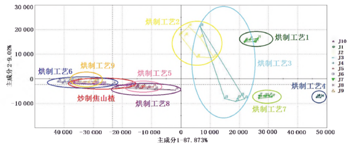 氣相電子鼻測定 主成份(PCA)分析 在快速氣相電子鼻中獲得的各焦山楂炮制品的氣相色譜信息,以峰面積作為PCA分析的輸入值,對炒制焦山楂和烘制焦山楂進行分析比較,結(jié)果見圖3。從PCA二維圖中可知主成分1(PC1)和主成分2(PC2)總貢獻率為96.893%,能較好地反映原始數(shù)據(jù)信息。烘制工藝5、6、8、9制備的焦山楂與炒制焦山楂的分布區(qū)域較為接近,而烘制工藝1、2、3、4、7制備的焦山楂與炒制焦山楂的分布區(qū)域相距較遠,說明烘制工藝5、6、8、9制備的焦山楂與炒制焦山楂相似程度更高。