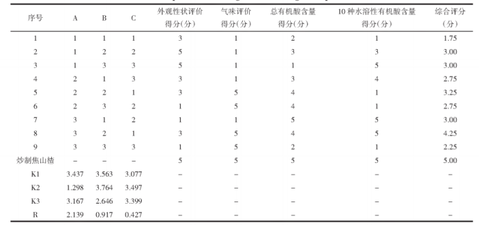 水溶性有機酸成分含量評價 根據(jù)與炒制焦山楂10種水溶性有機酸總含量的接近程度,對正交實驗中各組烘制焦山楂進行評分,評分標準見表3。