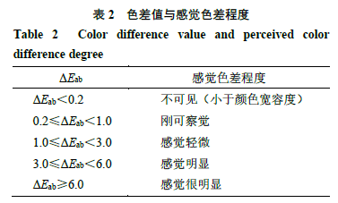 2.3基于電子眼技術(shù)的顏色分析 電子眼采用的色彩系統(tǒng)中L*代表明度指數(shù),a*(紅-綠軸)、b*(黃-藍(lán)軸)代表顏色對(duì)立維度。對(duì)于樣品1、2,ΔL*=L1*-L2*,為正值時(shí)樣品1顏色偏淺,為負(fù)值時(shí)樣品1顏色偏深。Δa*=a1*-a2*,為正值時(shí)樣品1顏色偏紅,為負(fù)值時(shí)樣品1顏色偏綠。Δb*=b1*-b2*,為正值時(shí)樣品1顏色偏黃,為負(fù)值時(shí)樣品1顏色偏藍(lán)。樣品顏色可用色度值(Eab*)表示,計(jì)算公式為Eab*=(L*2+a*2+b*2)1/2。2個(gè)樣品之間的色差為ΔEab,計(jì)算公式為ΔEab=(ΔL*2+Δa*2+Δb*2)1/2,色差值與人眼感覺(jué)色差程度的關(guān)系見(jiàn)表2。