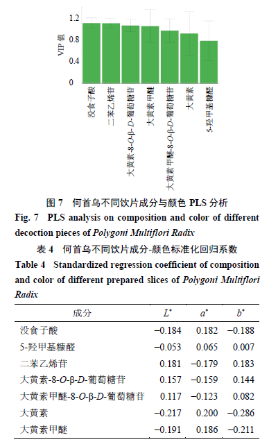 2.5何首烏不同飲片主要成分含量與顏色變化的相關(guān)性分析 普通多元線性回歸建模前提必須滿足樣本數(shù)量較多,變量數(shù)量較少,且變量之間無(wú)多重共線性的條件才具有合理性,若數(shù)據(jù)不能完全滿足上述條件,則模型無(wú)法使用。本實(shí)驗(yàn)中變量較多,且成分之間存在多重共線性的問(wèn)題,因此無(wú)法采用普通多元線性回歸模型。偏最小二乘回歸(partial least squares regression,PLS)法可以提取出對(duì)因變量解釋最強(qiáng)、影響最大的綜合變量,辨識(shí)系統(tǒng)中的信息與噪聲,因此很大程度上能夠克服變量之間的多重相關(guān)性在回歸建模中的不良作用,可以有效地解決在普通多元線性回歸的建模過(guò)程中因自變量之間存在多重相關(guān)性而影響參數(shù)估計(jì)的準(zhǔn)確性和合理性的問(wèn)題,縮小模型誤差,增強(qiáng)模型的穩(wěn)健性[19]。 在PLS回歸模型中,R2X和R2Y分別表示模型對(duì)自變量和因變量的解釋能力,Q2表示模型的預(yù)測(cè)能力,通常認(rèn)為上述3個(gè)指標(biāo)以大于0.5為宜,越接近1表示模型擬合數(shù)據(jù)效果越好;自變量在解釋因變量時(shí)作用的重要性可以用變量投影重要性指標(biāo)(VIP)來(lái)度量,通常認(rèn)為VIP值大于1的自變量對(duì)因變量有顯著影響。 將測(cè)得的成分含量數(shù)據(jù)與顏色指標(biāo)L*、a*、b*值導(dǎo)入SIMCA 14.1軟件,以成分含量作為自變量,各顏色指標(biāo)作為因變量,建立PLS模型。建立的PLS模型R2X=0.991,R2Y=0.988,Q2=0.981,說(shuō)明建立的模型穩(wěn)定且預(yù)測(cè)能力較強(qiáng)。根據(jù)VIP值>1的原則,可發(fā)現(xiàn)沒(méi)食子酸、二苯乙烯苷、大黃素-8-O-β-D-葡萄糖苷、大黃素甲醚對(duì)何首烏的各顏色指標(biāo)有顯著影響,5-羥甲基糠醛、大黃素甲醚-8-O- β-D-葡萄糖苷、大黃素對(duì)何首烏顏色無(wú)顯著影響。見(jiàn)圖7。 根據(jù)PLS模型的回歸系數(shù)(表4),沒(méi)食子酸、大黃素、大黃素甲醚的含量與L*、b*值呈負(fù)相關(guān),與a*值呈正相關(guān);5-羥甲基糠醛的含量與L*值呈負(fù)相關(guān),與a*、b*值呈正相關(guān);二苯乙烯苷、大黃素-8-O-β-D-葡萄糖苷、大黃素甲醚-8-O-β-D-葡萄糖苷的含量與L*、b*值呈正相關(guān),與a*值呈負(fù)相關(guān)。提示沒(méi)食子酸、大黃素、大黃素甲醚這3種成分與何首烏飲片變深、變紅、變藍(lán)有關(guān),與炮制后何首烏飲片顏色總體變化相一致;二苯乙烯苷、大黃素-8-O-β-D-葡萄糖苷、大黃素甲醚-8-O-β-D-葡萄糖苷這3種成分與何首烏飲片變淺、變綠、變黃有關(guān),與炮制后何首烏飲片顏色總體變化相反。