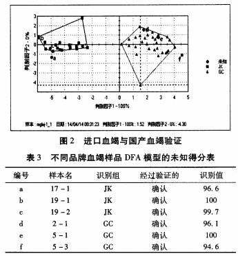 從上表可以看出,用以測試的6組數(shù)據(jù)中 ,經(jīng)過驗證所有組的識別值均大于 90% ,表明 DFA模型對本課題所得的血竭樣品的預(yù)測結(jié)果正確率較高。從識別組來看 ,絕大部分數(shù)據(jù)組給 出了正確的識別 ,說明DFA模型在判別國產(chǎn)血竭和進口血竭中具有一定的應(yīng)用意義 。