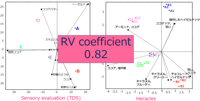 通過TDS持續(xù)時間生成的主成分分析圖:A,B,C,D,E 這幾個樣品都有不同的感官特征,比如A產品的榛子味濃一些,C產品的烤可可味更濃一些。