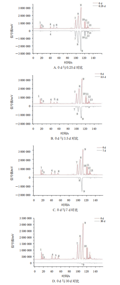 不同放置時間成人型香囊的氣味信息鏡像對比圖見圖4。由圖4可知,成人型香囊放置0.25d后,有4種氣味成分消失;放置15d后,6~8號峰消失,5號峰強度較放置0d時下降了34.3%;放置30d后,9號峰基本消失。