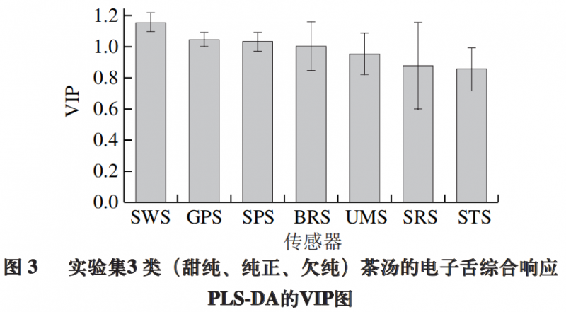 為進(jìn)一步探明電子舌7 根傳感器的響應(yīng)值對滋味分組的貢獻(xiàn),篩選出影響甜純滋味識別的關(guān)鍵傳感器,將上述PLS-DA模型做載荷分析。如圖2所示,對甜純滋味識別影響較大的變量可能為SWS(甜)、UMS(鮮)、SPS(綜合),其w×c值分別為0.47、0.42、0.42,以變量SWS(甜)貢獻(xiàn)為最大。進(jìn)一步采用變量投影重要性(variable important for the projection,VIP)篩選關(guān)鍵差異變量,如圖3所示。結(jié)果表明,VIP值大于1.0的變量包括SWS(甜)、GPS和SPS(復(fù)合味覺)及BRS(苦),其中以SWS(甜)的VIP值為最高。SWS甜味傳感器對甜純組茶湯的響應(yīng)顯著高于純正組和欠純組(P<0.001),而對于純正組和欠純組的響應(yīng)差異則不顯著(圖4)。上述結(jié)果表明SWS甜味傳感器可能是識別甜純滋味的關(guān)鍵因子。