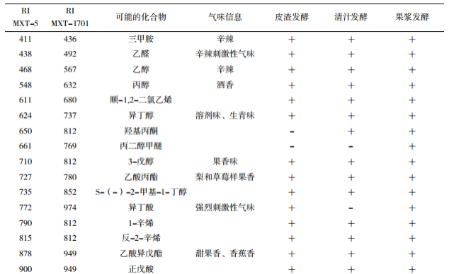 圖3 不同發(fā)酵方式的柿子酒的判別因子分析 電子鼻對不同發(fā)酵方式柿子酒揮發(fā)性香氣成分的定性分析 由表2可知,3種發(fā)酵方式柿子酒的香氣成分中大部分化合物都有存在,其中,醇類、酯類等分子量較小的揮發(fā)性物質(zhì)占絕大多數(shù)。皮渣發(fā)酵、清汁發(fā)酵、果漿發(fā)酵柿子酒的香氣成分中醇類和酯類分別約占50%、52%和46%。3種方式發(fā)酵柿子酒香氣成分中都含有3-戊醇(果香味)、乙酸丙酯(梨和草莓樣果香)、辛醇(強烈的柑橘香氣)、己酸丁酯(特有的菠蘿香氣),使柿子酒增添了獨特風(fēng)味。皮渣發(fā)酵中含有β-紫羅酮(紫羅蘭、甜果香),清汁發(fā)酵中含有正壬基苯和磷酸三丁酯,果漿發(fā)酵中含有丙二醇甲醚,表示不同發(fā)酵方式柿子酒的香氣成分存在差異。 表2 不同發(fā)酵方式柿子酒中可能的風(fēng)味信息