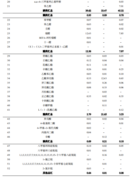 結(jié)論 利用電子鼻、氣相-質(zhì)譜聯(lián)用及感官評價3種技術(shù)從不同方面對柿子酒揮發(fā)性香氣成分進(jìn)行了檢測和評價。 電子鼻對不同發(fā)酵方式柿子酒揮發(fā)性香氣成分分析 通過電子鼻主成分分析和判別因子分析發(fā)現(xiàn),清汁發(fā)酵與皮渣發(fā)酵柿子酒中揮發(fā)性香氣成分差異較小,與果漿發(fā)酵柿子酒中揮發(fā)性香氣成分差異較大。通過電子鼻定性分析,清汁發(fā)酵、皮渣發(fā)酵、果漿發(fā)酵柿子酒香氣成分中,醇類酯類分別約占52%、50%和46%。3種方式發(fā)酵柿子酒香氣成分中都含有3-戊醇(果香味)、乙酸丙酯(梨和草莓樣果香)、辛醇(強烈的柑橘香氣)、己酸丁酯(特有的菠蘿香氣),為柿子酒增加了獨特風(fēng)味。 氣相-質(zhì)譜聯(lián)用對不同發(fā)酵方式柿子酒揮發(fā)性香氣成分分析 通過氣相-質(zhì)譜聯(lián)用對不同發(fā)酵方式柿子酒揮發(fā)性香氣成分分析可知,異戊醇、正己醇、乙酸異丁酯等物質(zhì)相對峰面積最大,是柿子酒香氣成分中的主要成分。清汁發(fā)酵柿子酒揮發(fā)性香氣成分中脂類數(shù)量多,為27種,果漿發(fā)酵次之。因此,清汁發(fā)酵的柿子酒酒香更濃郁,更具典型性,感官得分最高。 柿子酒中主要香氣成分 皮渣發(fā)酵柿子酒主要香氣物質(zhì)為縮醛、丁二酸二乙酯、3-羥基-2-丁酮、2-甲基丁醇。清汁發(fā)酵柿子酒主要香氣成分為乙酸異戊酯、2-糠酸乙酯、乳酸乙酯、S-(-)-2-甲基-1-丁醇。果漿發(fā)酵柿子酒主要香氣物質(zhì)為縮醛、丁二酸二乙酯、3-羥基-2-丁酮、S-(-)-2-甲基-1-丁醇。