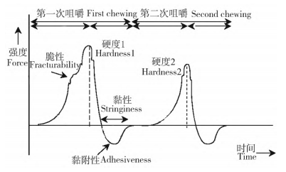 質(zhì)地剖面分析測(cè)試原理是模擬人體口腔咀嚼運(yùn)動(dòng),通過(guò)對(duì)樣品2次擠壓進(jìn)行測(cè)定。質(zhì)地剖面分析曲線見(jiàn)圖1。咀嚼性為硬度、凝聚力和彈性3個(gè)參數(shù)值的乘積,常作為質(zhì)地結(jié)構(gòu)綜合指標(biāo)。