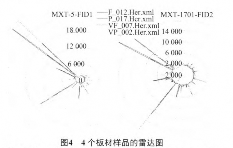 可將氣相色譜信息處理成雷達圖的形式(圖4),更為形象地展現(xiàn)樣品區(qū)別。出現(xiàn)較大的成分區(qū)別的原因:1)生產(chǎn)板材所使用的原料不同;2)板材生產(chǎn)過程中的工藝、施膠量、施膠種類、時間及是否貼面等的區(qū)別。這為分辨不同板材提供了有力的證明。