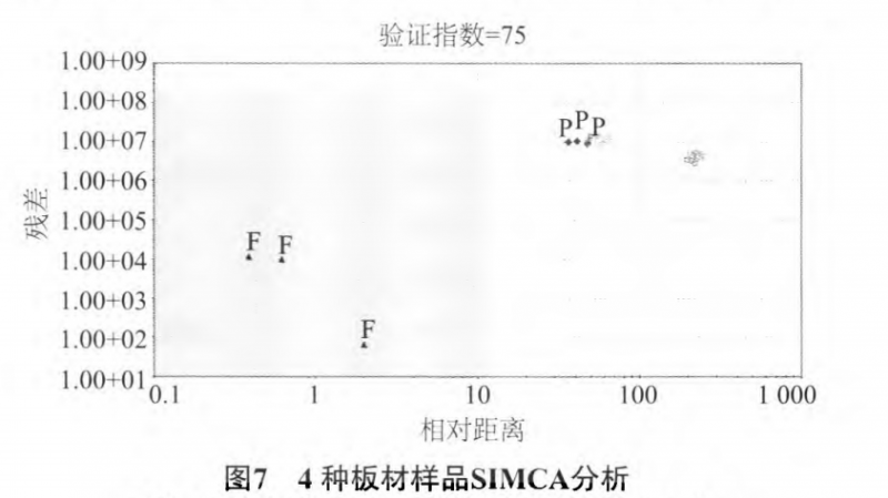 圖8為以纖維板F為控制樣,建立板材樣品的SQC 分析圖。由圖中可知,纖維板F分布在控制區(qū)域內(nèi),其他3種板材樣品則分布在控制區(qū)域外。與SIMCA分析的效果一樣,都可以對產(chǎn)品質(zhì)檢品控和板材種類辨別分析提供參考和幫助。