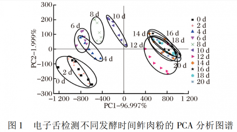 從圖 1 和圖 2 可以看出,在鲊肉粉發(fā)酵第 0 ~ 10 天,鲊肉粉樣品沿第一主成分增大的方向移動,說明隨著發(fā)酵時間的延長,鲊肉粉發(fā)酵產(chǎn)生的滋味物質(zhì)也隨之改變,從 PCA 圖譜得出第 12 ~ 20 天絕大部分重疊在一起,說明鲊肉粉的滋味物質(zhì)沒有明顯改變; 從DFA 圖譜得出第 12 ~ 16 天鲊肉粉從左下方向右上方移動且小部分與第 18 天和第 20 天重疊,說明鲊肉粉在中后期鲊肉粉滋味物質(zhì)隨時間延長而改變至趨于穩(wěn)定,經(jīng)對比分析,DFA 比 PCA 能更好地分析隨時間改變鲊肉粉滋味物質(zhì)的不同。