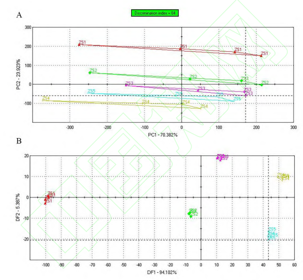 5種抓飯電子鼻檢測(cè)主成分分析PCA結(jié)果如圖1所示,第1主成分區(qū)分貢獻(xiàn)率為54.178%,第2主成分區(qū)分貢獻(xiàn)率為38.429%,2個(gè)主成分累計(jì)貢獻(xiàn)率92.607%,總貢獻(xiàn)率超過(guò)85%表明試驗(yàn)方法的可行性,說(shuō)明PC1和PC2兩軸包含了PCA轉(zhuǎn)換中絕大部分的貢獻(xiàn)率,主要成分可以較好地反映原來(lái)多指標(biāo)的信息。ZS4和ZS5判別指數(shù)為7.4%,表明這兩個(gè)抓飯的香氣高度相似。判別因子分析DFA分析可知,不同抓飯?jiān)贒FA圖中分別有各自的區(qū)域并且沒(méi)有重疊。其中主成分1(DF1)的貢獻(xiàn)率達(dá)到了88.227%,主成分2(DF2)的貢獻(xiàn)率達(dá)到了9.237%,主成分1(DF1)和主成分2(DF2)的累積方差貢獻(xiàn)率為97.464%,包含了樣品絕大部分信息,說(shuō)明用DFA來(lái)表示電子鼻整體信息非常可信。電子鼻結(jié)合DFA可以很好地區(qū)分5種市售抓飯。