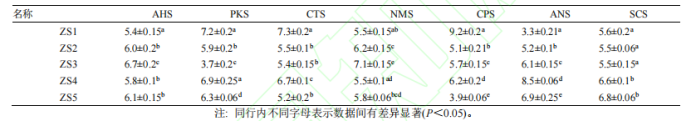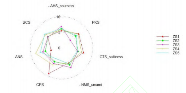 圖2 電子舌檢測(cè)不同抓飯的PCA和DFA分析圖譜 表1是5個(gè)不同品種抓飯電子舌區(qū)別指數(shù)分析,ZS2、ZS3、ZS5區(qū)別指數(shù)分別為6.59,9.56,12.87,距離值最小,可知三者味覺(jué)的相似性較大。ZS1和ZS4的距離值最大43.25,可知兩者的相似性最小。