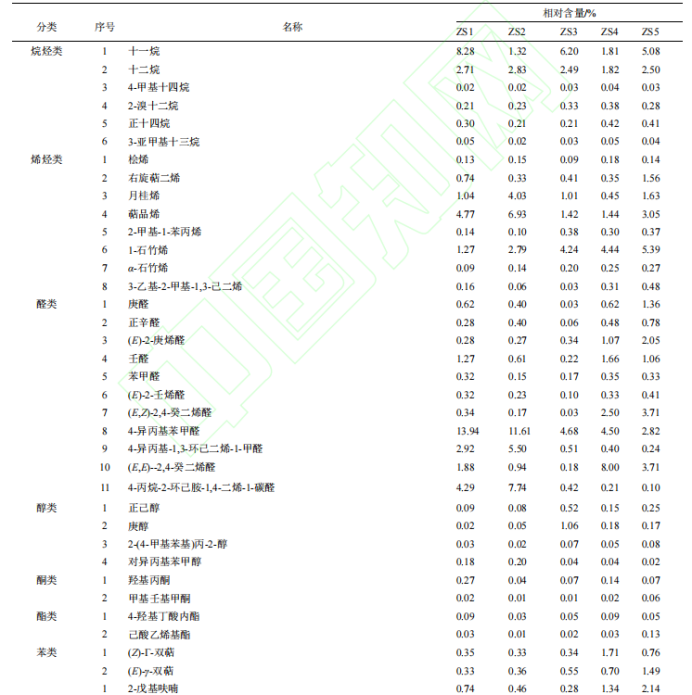 GC-MS檢測(cè)揮發(fā)性物質(zhì)種類(lèi)與含量 5種市售抓飯共鑒定出132種化合物,其中包括烷烴(25種)、烯烴(16種)、醛類(lèi)(27種)、醇類(lèi)(26種)、酮類(lèi)(11種)、酯類(lèi)(9種)、苯酚類(lèi)(15種)、其它(3種)。從圖4可以看出,ZS1鑒定出87種,其中醛類(lèi)(43.31%)、烷烴(20.54%)相對(duì)含量較高;ZS2鑒定出92種,其中醛類(lèi)(50.68%)、烯烴(17.41%)、烷烴(10.53%)相對(duì)含量較高;ZS3鑒定出74種,其中烷烴(11.11%)、烯烴(8.11%)相對(duì)含量較高;ZS4鑒定出92種,其中醛類(lèi)(32.47%)、烯烴(11.12%)相對(duì)含量較高;ZS5鑒定出86種,其中醛類(lèi)(30.04%)烯烴(16.85%)相對(duì)含量較高。