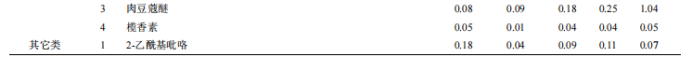 圖4 不同抓飯揮發(fā)性成分分類(lèi)和相對(duì)含量統(tǒng)計(jì) 5組抓飯GC-MS分析如表4所示,共檢測(cè)出共有揮發(fā)性風(fēng)味物質(zhì)39種,主要包括:烷烴類(lèi)(6種)相對(duì)平均含量7.67%,烯烴類(lèi)(8種)相對(duì)平均含量10.25%、醛類(lèi)(11種)相對(duì)平均含量19.58%、醇類(lèi)(4種)相對(duì)平均含量0.66%、酯類(lèi)(2種)相對(duì)平均含量0.1%、酮類(lèi)(2種)相對(duì)平均含量0.14%、雙萜類(lèi)(2種)相對(duì)平均含量1.39%、其它(4種)相對(duì)平均含量1.46%。5組抓飯共有化合物相對(duì)平均含量為41.252%。相對(duì)平均含量超過(guò)1%的化合物有10種分別為:十一烷(4.54%)、十二烷(2.47%)、月桂烯(4.54%)、萜品烯(3.52%)、1-石竹烯(3.63%)、(E,Z)-2,4-癸二烯醛(1.35%)、4-異丙基苯甲醛(7.51%)、4-異丙基-1,3-環(huán)己二烯-1-甲醛(1.91%)、反式-2,4-癸二烯醛(2.94%)、4-丙烷-2-環(huán)己胺-1,4-二烯-1-碳醛(2.55%),這10種化合物相對(duì)總含量達(dá)到34.96%,占共有化合物相對(duì)含量的84.7%。 表3 基于氣相色譜質(zhì)譜(GC-MS)鑒定抓飯共有揮發(fā)性成分
