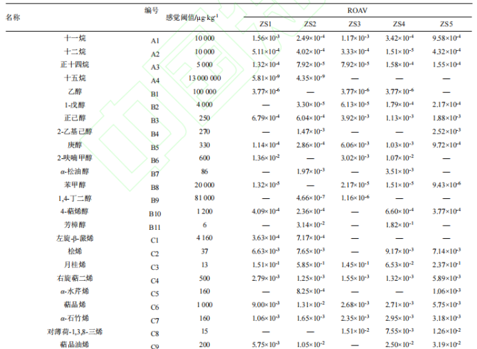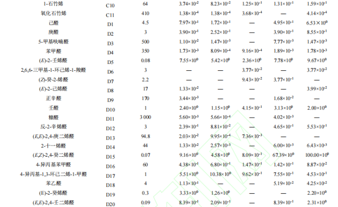 根據(jù)文獻(xiàn)查閱感覺(jué)閾值并計(jì)算抓飯香氣成分ROAV,本研究只針對(duì)能查到感覺(jué)閾值的化合物。篩選ROAV大于0.1的揮發(fā)性物質(zhì)分析,結(jié)果如表4所示,(E,Z)-2,4-癸二烯醛對(duì)抓飯香氣貢獻(xiàn)最大,定義其為ROAVmax=100,ROAV≥1的物質(zhì)對(duì)抓飯香氣貢獻(xiàn)較大,0.1≤ROAV<1的物質(zhì)對(duì)抓飯香氣有重要的修飾作用。月桂烯、1-石竹烯、己醛、庚醛、(E)-2-壬烯醛、反-2-辛烯醛、壬醛、(E,Z)-2,4-癸二烯醛、4-異丙基苯甲醛、4-異丙基-1,3-環(huán)己二烯-1-甲醛、苯乙醛、(E)-2-癸烯醛、(E,E)-2,4-壬二烯醛、(E,E)-2,4-癸二烯醛、(E)-2-庚烯醛、α-紫羅酮、β-紫羅酮、2-正戊基呋喃18種化合物ROAV大于0.1,為抓飯香氣主要香氣成分。其中(E,Z)-2,4-癸二烯醛、(E,E)-2,4-癸二烯醛、4-異丙基-1,3-環(huán)己二烯-1-甲醛、(E)-2-癸烯醛、壬醛、(E)-2-壬烯醛、β-紫羅酮7種化合物ROAV大于1,為抓飯關(guān)鍵香氣成分,其余11種化合物對(duì)抓飯香氣具有重要修飾作用。 表4 抓飯揮發(fā)性風(fēng)味物質(zhì)的香氣閾值及ROAV