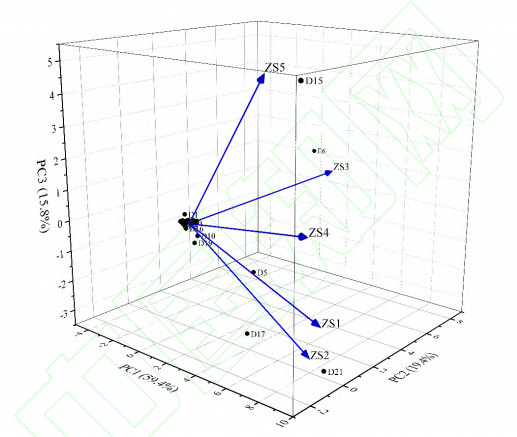 為進(jìn)一步研究抓飯揮發(fā)性成分的變化,采用主成分分析法對(duì)抓飯ROAV進(jìn)行分析。由圖5可知,第一主成分方差貢獻(xiàn)率為59.4%,第二主成分方差貢獻(xiàn)率為19.4%,第三主成分方差貢獻(xiàn)率為15.8%,前3個(gè)主成分方差累計(jì)率為94.6%,表明3個(gè)主成分能夠代表原始數(shù)據(jù)的信息。在第一主成分上,D5[(E)-2-壬烯醛]、D10(壬醛)、D15[(E,Z)-2,4-癸二烯醛]、D19[(E)-2-癸烯醛]、D21[(E,E)-2,4-癸二烯醛]、E6(β-紫羅酮)為正影響,其余為負(fù)影響;在第二主成分上,D5[(E)-2-壬烯醛]、D10(壬醛)、D17(4-異丙基-1,3-環(huán)己二烯-1-甲醛)、E6(β-紫羅酮),D15[(E,Z)-2,4-癸二烯醛]較高負(fù)影響;在第三主成分上,D1(己醛)、D15[(E,Z)-2,4-癸二烯醛]、E6(β-紫羅酮)較高整影響,C3(月桂烯)、D2(庚醛)、D5[(E)-2-壬烯醛]、D10(壬醛)、D16(4-異丙基苯甲醛)、D17(4-異丙基-1,3-環(huán)己二烯-1-甲醛)、D19[(E)-2-癸烯醛]、D21[(E,E)-2,4-癸二烯醛]為負(fù)影響。表明這些揮發(fā)性物質(zhì)可能是影響不同市售抓飯風(fēng)味差異的關(guān)鍵物質(zhì)。