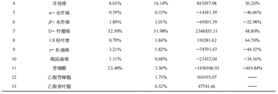 花椒作物在我國很多地區(qū)都有種植,花椒的揮發(fā)油是花椒香氣的主要來源,也是反映花椒香氣的主要指標(biāo),花椒中揮發(fā)油的含量及組成成分不僅受到花椒品種、產(chǎn)地環(huán)境因子(如產(chǎn)地氣候、雨量、日照時(shí)間、土質(zhì)等)的影響,還受到提取加工方法、提取部位和采收時(shí)期等外在因素的影響。 超快速氣相電子鼻技術(shù)具有分析速度快、靈敏度高和檢測(cè)費(fèi)用低等優(yōu)點(diǎn)。超快速氣相電子鼻將雙快速氣相色譜檢測(cè)與基于多變量統(tǒng)計(jì)的強(qiáng)大數(shù)據(jù)處理和感官及化學(xué)表征(Arochembase)的可選模塊相結(jié)合,利用超快速氣相電子鼻技術(shù),解析不同品種花椒及花椒提取物揮發(fā)性化合物,通過主成分分析建立產(chǎn)品有效判別模型,同時(shí)解析花椒物質(zhì)構(gòu)成。 不同產(chǎn)地花椒原料、花椒精油產(chǎn)品、花椒油產(chǎn)品、nC6-nC16標(biāo)準(zhǔn)溶液。 超快速氣相電子鼻;零空氣發(fā)生器;氫氣發(fā)生器;20mL頂空進(jìn)樣瓶,電子天平。 花椒:取0.2g花椒顆粒于20mL頂空進(jìn)樣瓶中,迅速加蓋密封檢測(cè),設(shè)置3個(gè)平行樣品,降低檢測(cè)誤差。 花椒精油:將花椒精油搖晃均勻后,取20uL于20mL頂空進(jìn)樣瓶中,加蓋密封檢測(cè),每個(gè)樣品設(shè)置3個(gè)平行樣。 花椒油:將花椒油搖晃均勻后,使用電子天平稱取0.1g于20mL頂空進(jìn)樣瓶中,加蓋密封檢測(cè),設(shè)置3個(gè)平行樣品。 花椒原料:樣品量0.2g,進(jìn)樣體積500uL,孵化溫度80℃,孵化時(shí)間20min,50℃恒溫30s,1℃/s速率升溫至80℃恒溫30s,3℃/s速率升溫至125℃恒溫10s,3℃/s速率升溫至250℃恒溫11s。 花椒精油:取樣量100μL,捕集溫度40℃,孵化溫度60℃,孵化時(shí)間10min,載氣流量30mL/min;進(jìn)樣量1000uL,進(jìn)樣口溫度200℃,閥溫度為250℃;FID溫度260℃,升溫程序:初始溫度45℃,保持35s,1.0℃/s升至70℃,保持30s,0.5℃/s升至140℃,3.0℃/s升至250℃,保持21s,采集時(shí)間共計(jì)288s。花椒油:取樣量0.1g,捕集溫度40℃,孵化溫度60℃,孵化時(shí)間20min,載氣流量30mL/min;進(jìn)樣量500uL,進(jìn)樣口溫度200℃,閥溫度為260℃,F(xiàn)ID溫度為260℃,升溫程序:初始溫度50℃,保持30s,1.0℃/s升至85℃,保持30s,1.0℃/s升至125℃,保持10s,3.0℃/s升至250℃,保持10s,采集時(shí)間共計(jì)197s。 將裝有樣品的頂空小瓶按照順序依次放入樣品盤,每3個(gè)平行樣品后面放入一個(gè)空瓶,目的是為了消除樣品帶來的信號(hào)干擾,選擇程序進(jìn)行樣品分析。 使用Heracles超快速氣相電子鼻自帶軟件Alphasoft進(jìn)行樣品數(shù)據(jù)處理,明確揮發(fā)性風(fēng)味物質(zhì)種類與含量。 利用正構(gòu)烷烴標(biāo)準(zhǔn)溶液(nC6-nC16)進(jìn)行校準(zhǔn),進(jìn)行保留時(shí)間與保留參數(shù)之間的轉(zhuǎn)換,利用超快速氣相電子鼻自帶數(shù)據(jù)庫AroChembase數(shù)據(jù)庫對(duì)樣品中的成分進(jìn)行定性分析,采用峰面積歸一法對(duì)目標(biāo)化合物進(jìn)行定量分析,確定各香氣成分相對(duì)含量。 采用正構(gòu)烷烴標(biāo)準(zhǔn)溶液(nC6-nC16)對(duì)檢測(cè)方法進(jìn)行校準(zhǔn),結(jié)合超快速氣相電子鼻自帶AroChembase數(shù)據(jù)庫對(duì)樣品中主要揮發(fā)性成分進(jìn)行定性分析,推測(cè)得到匹配度高的化合物。 通過對(duì)比色譜圖(圖1)發(fā)現(xiàn),樣品間的出峰時(shí)間及出峰位置基本一致,峰面積間存在差異,說明樣品中揮發(fā)性成分的種類基本一致,含量上存在略微差異。 青花椒原料中共分析出11種含量較高成分,紅花椒原料中共分析出13種含量較高成分,乙酸芳樟酯與乙酸香葉酯在青花椒中未曾檢測(cè)出。通過計(jì)算,可知青、紅花椒不僅成分種類上有差異,各成分含量上同樣差異明顯。除1R-(+)-α-蒎烯、1,8桉葉素、乙酸芳樟酯、乙酸香葉酯外,其他成分均是青花椒中含量較紅花椒高。其中,青紅花椒原料中芳樟醇含量差別最大,差異最為明顯,D-檸檬烯含量差別較大,但相對(duì)偏差不大,推斷不是造成青紅花椒風(fēng)味不同的主要差異。乙酸芳樟酯、乙酸香葉酯僅存在于紅花椒原料中,由此可利用花椒原料產(chǎn)品中芳樟醇、乙酸芳樟酯、乙酸香葉酯含量區(qū)分花椒原料種類。 表1 武都紅花椒、金陽青花椒原料特征化合物相對(duì)含量與峰面積差異 青花椒精油中共分析出11種含量較高成分,紅花椒精油中共分析出13種含量較高成分,乙酸芳樟酯與乙酸香葉酯在青花椒中未曾檢測(cè)出,與原料表現(xiàn)一致。通過計(jì)算峰面積差值和含量偏差可知,乙酸芳樟酯等酯類物質(zhì)僅存在于紅花椒中。1R-(+)-α-蒎烯、月桂烯、D-檸檬烯、1,8桉葉素在紅花椒精油中含量較高,其他組分在青花椒精油中含量較高,和原料情況不一致,可能和提取工藝有關(guān)。其中芳樟醇含量差別最大,差異最為明顯,乙酸芳樟酯、乙酸香葉酯僅存在于紅花椒精油產(chǎn)品中,由此可利用花椒精油產(chǎn)品中檜烯、β-蒎烯、芳樟醇含量和乙酸芳樟酯、乙酸香葉酯等酯類物質(zhì)存在與否來區(qū)分花椒精油種類。 表2 武都紅花椒精油、金陽青花椒精油特征化合物相對(duì)含量與峰面積差異