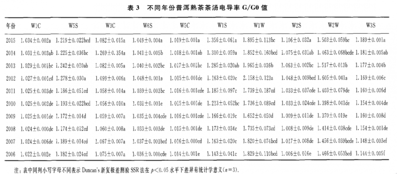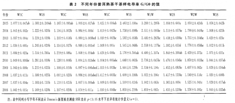 表 2至表 4為 10 個不同年份普洱熟茶的干茶、茶湯和葉底的具體的電導(dǎo)率 G/GO值。從表 2可知,對干茶香氣 G/GO值最大的傳感器是 w1w 和 W1S,其次是 w2w 和 W2S,其他 6個傳感器的 G/GO值較低;對茶湯香氣 G/GO值最大的傳 感器是 w1w 和 w2w ,其次是 W1S和 W5S,其他 6個傳感器的 G/GO值較低(表 3);葉底香氣 G/G0值的貢獻率大小順序與茶湯的相同,即為傳感器 w1w>w2w >w1s>w 5s(表4)。由表1所示的10個傳感器的性能可知,W1S傳感器對甲烷類揮發(fā) 性成分敏感,w1w ,w2w ,W2S和W 5S分別對硫化物,芳香成分、有機硫化物 ,乙醇和氮氧化合物等揮發(fā)性成分敏感。另外,不同年份普洱熟茶的香氣物質(zhì)不論 是干茶 、茶湯和葉底在其組成上基本一致 ,只是在干茶中乙醇?xì)怏w比和氮氧化合 物更為豐富。總體來看,上述幾類揮發(fā)性成分的含量在干茶中含量最高,茶湯次之 ,葉底最低;其中2011年干茶對 w 1s,w1w ,w2w ,W2S和 W5S傳感器的電導(dǎo)率基本上是所有茶樣中最高的。隨著貯藏年份的增加,上述幾類揮發(fā)性成分的含量 在干茶和茶湯中呈顯著的上升趨勢,在葉底中呈顯著的下降趨勢。
