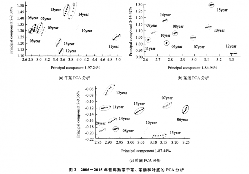 對干茶、茶湯和葉底香氣物質(zhì)進行 PCA 分析 (選取 55~60S的 6個檢測信號 ),干茶 (圖 2a)、茶湯 (圖2b)和葉底(圖 2c)的 PCA 分析結(jié)果顯示:干茶 、茶湯和葉底 的第一主成分區(qū)分貢獻率分別達到 97.24% ,84.94%和87.44 %,第二主成分區(qū)分 貢獻率分別達到 2.39% ,14.42% 和 9.36 %,兩個主成分區(qū)分的累計貢獻率分別 達到 99.63% ,99.36% 和 96.80% ,說明這兩個主成分已經(jīng)基本代表了樣品的主 要信息特征,PCA分析具有可行性。另外,在 PCA 的散點圖中 ,不同年份普洱熟茶香氣成分的數(shù)據(jù)采集點所在的橢圓形區(qū)域除2006年 至 2009年 的干茶之間以及 2009年與2010年的茶湯之間有部分重疊外 (圖 2a,2b),其余的都分布在特定的區(qū)域中,說明不同儲藏年份普洱熟茶的香氣有較大的差異,PCA分析可以將不同儲藏年份的普洱熟茶香氣歸類,并加以區(qū)分,且區(qū)分效果良好。