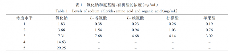 本文選取 L-谷氨酸 ( L-Glu ) 、L-賴氨酸( L-Lys) 、L-檸檬酸(L-Citric)、L-蘋果酸( L-Malic) 為研究對象,以0.03125、0.0625、0.125、0.25、0.50 moL /L( 即 1.83、3.66、7.31、14.63、29.25 mg /mL)的氯化鈉作為反應(yīng)濃度。將不同濃度的谷氨酸、賴氨酸、檸檬酸、蘋果酸 ( 表 1 所示) 分別添加至1.83、3.66、7.31、14.63、29.25 mg /mL 的氯化鈉溶液當中,配制成 4 組不同的溶液。