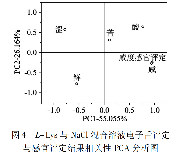 對L-Lys 與 NaCl 混合溶液的感官咸度評分和電子舌所測得的咸、酸、苦、澀、鮮五組數(shù)據(jù)進行主成分分析,如圖 4 所示,PC1 和 PC2 累積方差貢獻率為81.219%,“感官咸度評分”和電子舌數(shù)據(jù)“咸”在圖上位 置 重 合,而與電子舌其他數(shù) 據(jù)“酸”、“苦”、“澀”、“鮮”距離很遠,說明電子舌對溶液咸度的評分“咸”與感官咸度評分相關(guān)性較高。